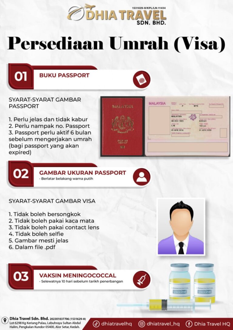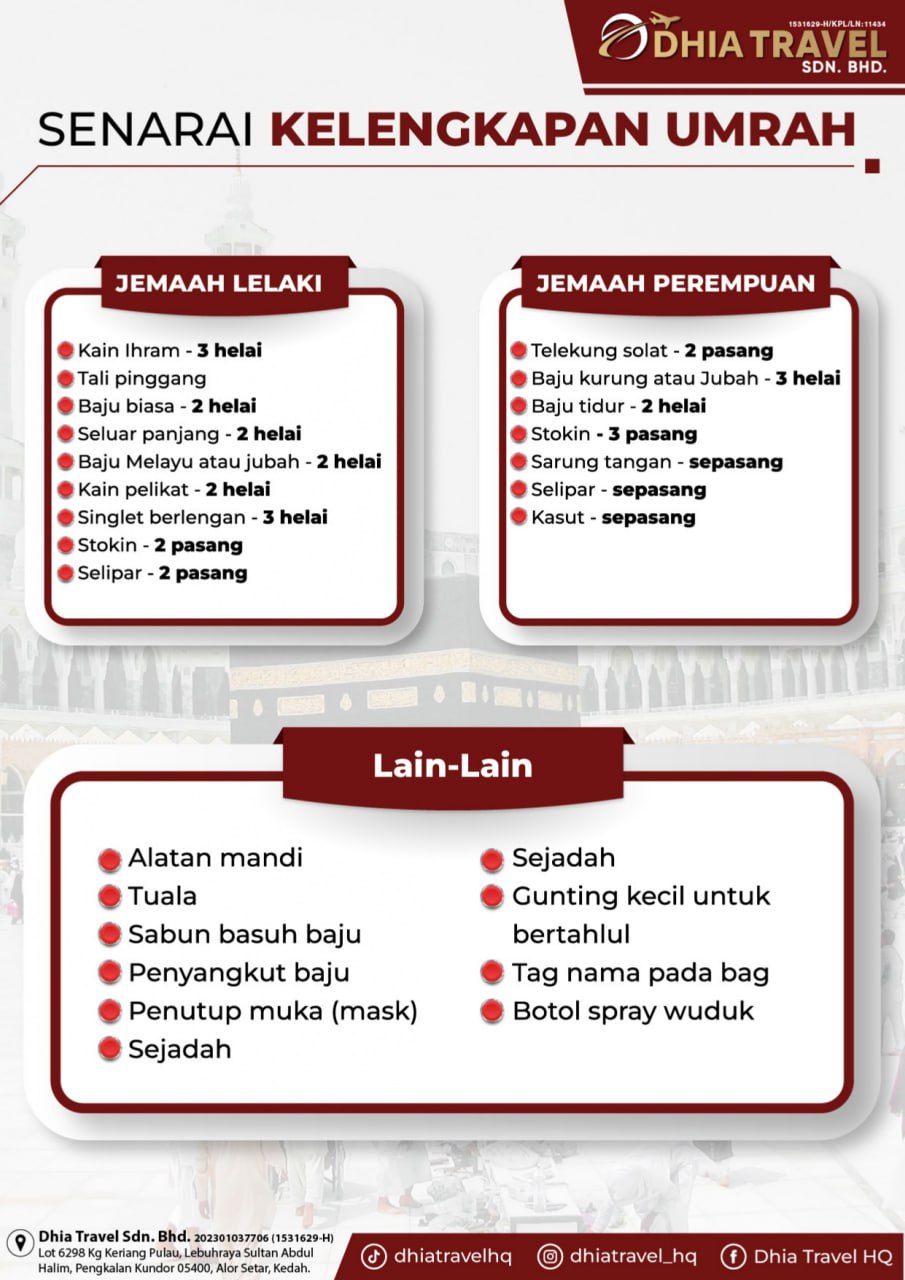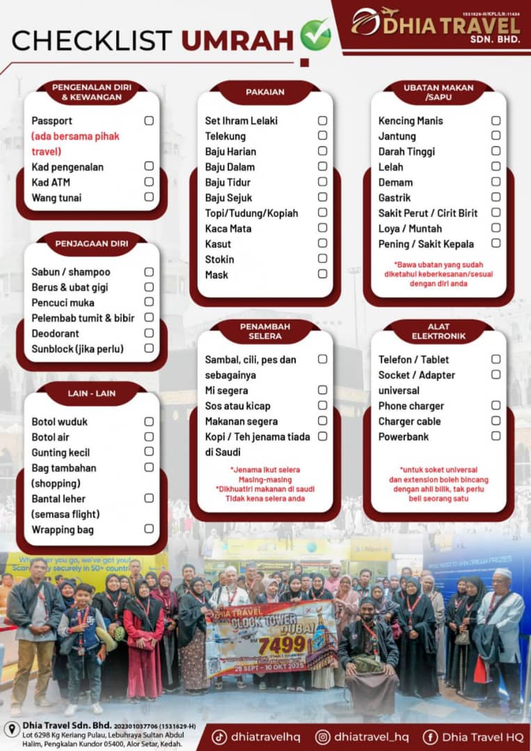 Dhia Travel Sdn Bhd menyediakan panduan lengkap meliputi dokumen penting (seperti pasport dan visa), senarai kelengkapan peribadi dan pakaian ihram, serta checklist perjalanan supaya jemaah lebih bersedia dari segi mental, fizikal dan rohani.
